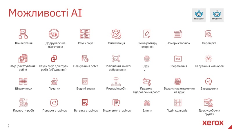 Фактично всі цифрові друкарські машини, які ми сьогодні завозимо в Україну, вже оснащені рішеннями на базі штучного інтелекту, зокрема програмним забезпеченням Xerox FreeFlow Core. Для нас це must have. А для замовника — без перебільшення, подарунок і прямий квиток у майбутнє разом із Xerox.