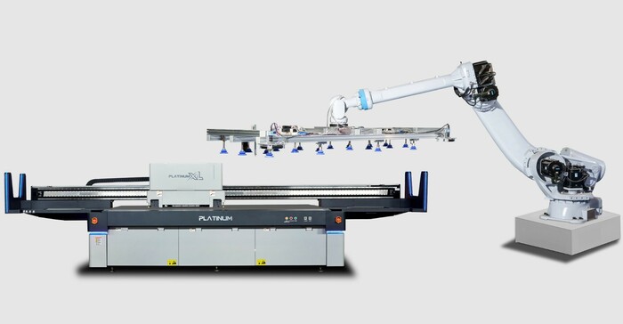 Роботизовану систему подачі та вивантаження листів продемонстрували разом із планшетним УФ-принтером Platinum KCXL+.