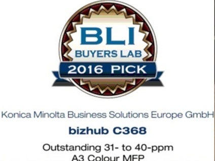 Buyers Laboratory LLC (BLI) присудила компанії Konica Minolta відзнаку «Зимовий Вибір BLI 2016» (BLI Winter Pick Award 2016) за багатофункціональні пристрої формату А3 bizhub C368 та bizhub 287. Ці моделі виділяються завдяки різноплановості та витривалості, нагороджені за «продуктивність», «драйвери з можливостями кастомізації» і «мобільний друк». В якості незалежної компанії, що оцінює офісне обладнання та додатки до нього, BLI проводить нагородження двічі на рік за визначні продукти і програмні рішення.