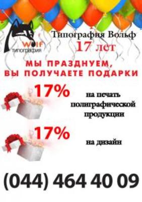 Спешим порадовать всех своих клиентов! Специальное предложение в честь 17-летия компании! Мы празднуем, Вы получаете подарки! Каждый клиент, сделавший заказ в ГК «Вольф», получает 17% скидку на дизайн-услуги и изготовление полиграфической продукции!