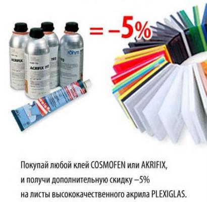 Акция от «Пластикс-Украина»: покупая любой клей Cosmofen или Akrifix, вы получаете дополнительную скидку 5% на листы высококачественного акрила Plexiglas. Акция действует до 30.07.2012