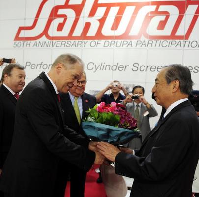 В рамках выставки drupa 2012 Вернер Дорншейдт, председатель совета директоров Messe Düsseldorf, и Бернард Шрейер, президент drupa, поблагодарили Ёсикуни Сакураи, генерального директора Sakurai Graphic Systems, за 50-летнюю поддержку мероприятия. В этом году семейная компания Sakurai продемонстрировала на выставке новую полностью автоматизированную 5-секционную листовую офсетную печатную машину Sakurai 580SDC с лакировальной секцией и удлиненной приемкой. Новинка работает с максимальным форматом 60x79 см на скорости до 15000 лист./час. Также были представлены две новые трафаретные машины в линии с УФ-сушкой и стекером Natgraph: Sakurai MS-80SD Maestro (машина ротационной трафаретной печати с сервоприводом формата 80x54 см) и Sakurai MS-102AII (машина ротационной трафаретной печати формата 75x105 см, производительностью до 4000 лист./час, с возможностью печати на материалах от 75 до 750 мкм). MacHOUSE
