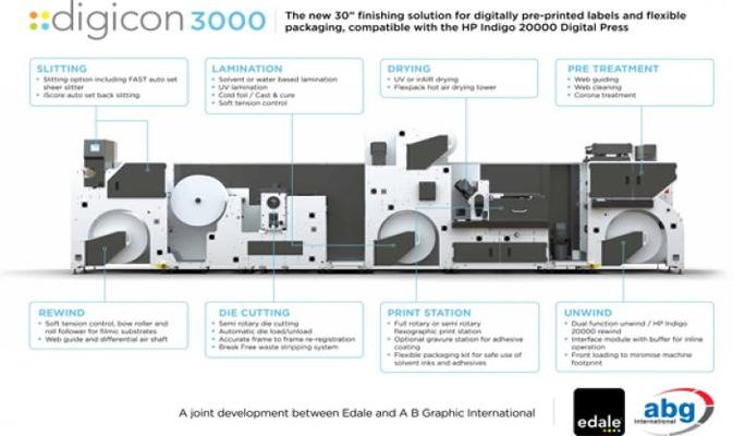 размотка; предварительная обработка полотна; ламинирование; высечка; печать (флексографская или глубокая); сушка; продольная резка; перемотка.Первая инсталляция Digicon 3000 состоится в американской типографии Innovative Labelling Solutions, которая одной из первых приобрела цифровую пчеатную машину HP Indigo 20000.