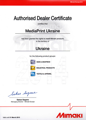 В середине апреля компания MediaprintUkraine продлила дилерское соглашение с Mimaki Engineering Co на продажу и сервисное обслуживание всей линейки оборудования Mimaki в Украине и Молдавии. 2013 год компания Mimakiотметила увеличением продаж своей технике в мире на 18%. А объемы продаж оборудования Mimaki в Украине выросли больше, чем на 20%. Сейчас компания Mimaki активно движется практически во всех направлениях широкоформатной печати — сольвентная печать, УФ-печать, печать латексными чернилами, печать по текстилю, сублимационные технологии, оборудование для порезки и т.д. В середине 2014 г. в продажу поступят новый бюджетный планшетный UVLED принтер MimakiJFX200-2513 и UJV500-160, а также будут новинки от Mimaki и в конце года. Очень важное событие для Mimaki в этом году – это 10-летие европейского представительства – MimakiEurope, празднование которого состоится в рамках выставки FESPA 2014 в конце мая в г. Мюнхене.