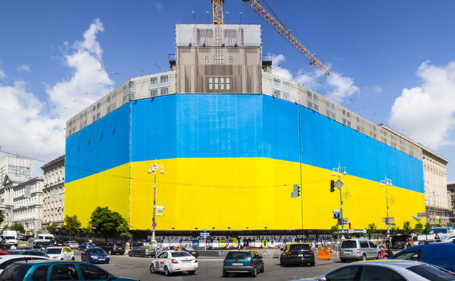 В мае фасад ЦУМа в Киеве украсил самый большой флаг Украины, изготовленный в широкоформатной типографии «Юнивест Препресс».