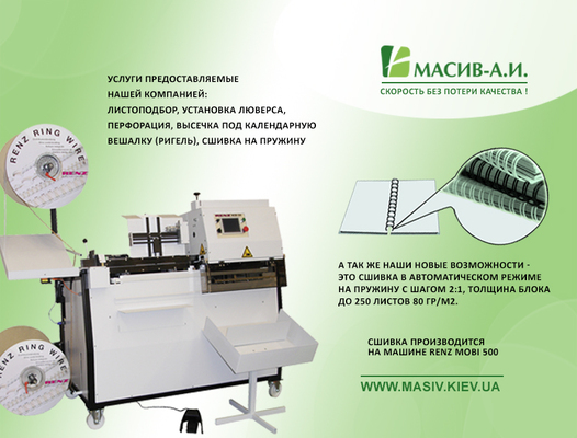 Полиграфический центр «МАСИВ-А.И.» (http://masiv.kiev.ua) дополнил свой производственный арсенал перфораторами «CK 620» для подготовки изделий к переплету на металлическую пружину шагом 2:1 для автоматического биндера Renz Mobi 500. Такая инвестиция стала необходимостью в связи с большим количеством запросов от партнеров и клиентов на данный вид полиграфических услуг в Киеве и Киевской области. В компании «МАСИВ-А.И.» отметили, что только за прошлый год в типографию обратилось более пятидесяти компаний с заказами на сборку шагом 2:1.
