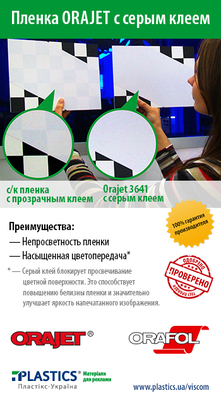 ВНИМАНИЕ!! Семейство пленок ORAJET пополнилось новинкой - пленка с серым клеем ORAJET 3641, толщиной 80 мкр. Серый клей блокирует просветность белой пленки, усиливая контрасность и насыщеность напечатаного изображения. При поклейке на темные поверхности даной пленки - изображение совершенно не теряет цветопередачу.