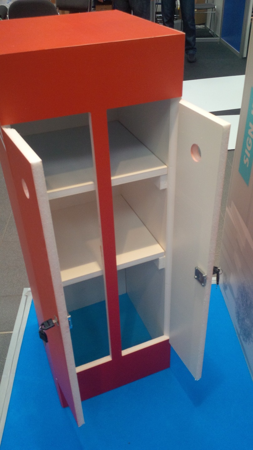 Как видно из фотографий, стенд для образцов сделан без каких-либо дополнительных материалов и систем крепления. Дверцы шкафчиков используются без петель и навесов. Материал обкладки Stadurlon дает возможность открывать и закрывать их без вероятности поломки в местах изгиба. Для изготовления конструкции использовалась V-образная фрезеровка панелей и склеивание с одной стороны.