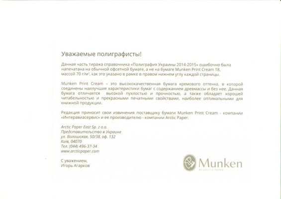 Часть тиража справочника «Полиграфия Украины 2014-2015» ошибочно была напечатана на обычной офсетной бумаге, а не на бумаге Munken Print Cream 18, массой 70 г/м2, как это указано в рамке в правом нижнем углу каждой страницы.