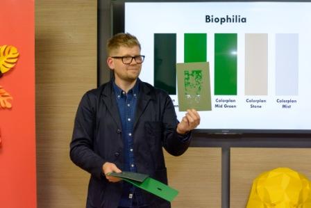 Все это стало толчком для создания новой коллекции Colorplan, которая называется «Биофилия». Это четвертая цветовая карта, созданная компанией GF Smith и пользующаяся сегодня большой популярностью. По окончании презентации Бен Уоткинсон продемонстрировал примеры организации рабочего пространства в офисе, пространства для отдыха в ресторане с использованием зеленых оттенков.