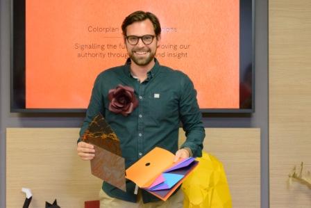 Ян Ричнер и Лариса Писаренко начали презентацию коллекции с небольшого путешествия в прошлое. Коллекция Colorplan появилась на рынке в 1936 году. Она стартовала с трех цветов (серый, коричневый и белый), а затем в результате всевозможных исследований, переговоров с дизайнерами, творческими людьми, коллекция разрослась до сегодняшних масштабов – до 51 цвета!