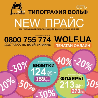 Типография Вольф объявляет о весеннем снижении цен на весь ассортимент продукции оптового прайса. Много печатаете? Являетесь рекламным или ивент агентством, типографией или клиентом, которому необходимы большие объемы полиграфии??