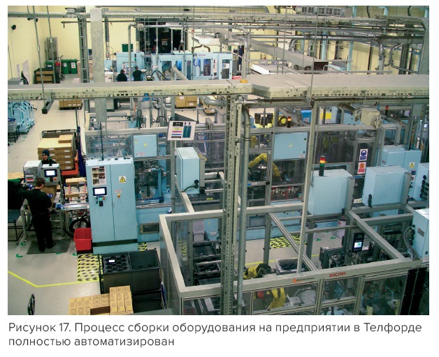 В Телфорде расположено крупнейшее в Европе производство Ricoh, где работают более 700 человек. Изготовленные в Японии аппараты поступают на завод в Англии в виде готовых модулей, где их снова разбирают и собирают в заданной конфигурации, выполняя дополнительную настройку, при необходимости обновляют встроенное ПО и выполняют контроль качества перед отправкой заказчику.