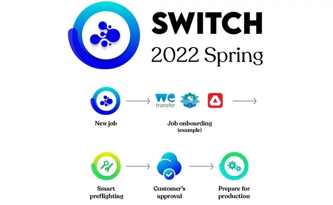 Індивідуальне рішення Switch є платформою автоматизації робочих процесів, яка поєднує процеси MIS, кольоропроби, друку з Інтернету, попередньої перевірки PDF-файлів, затвердження замовником і підготовки до виробництва. Це дає змогу широкоформатним друкарням створити повністю автоматизований процес, щоб заощадити час та витрати і, зрештою, підвищити цінність по всьому ланцюжку створення вартості.