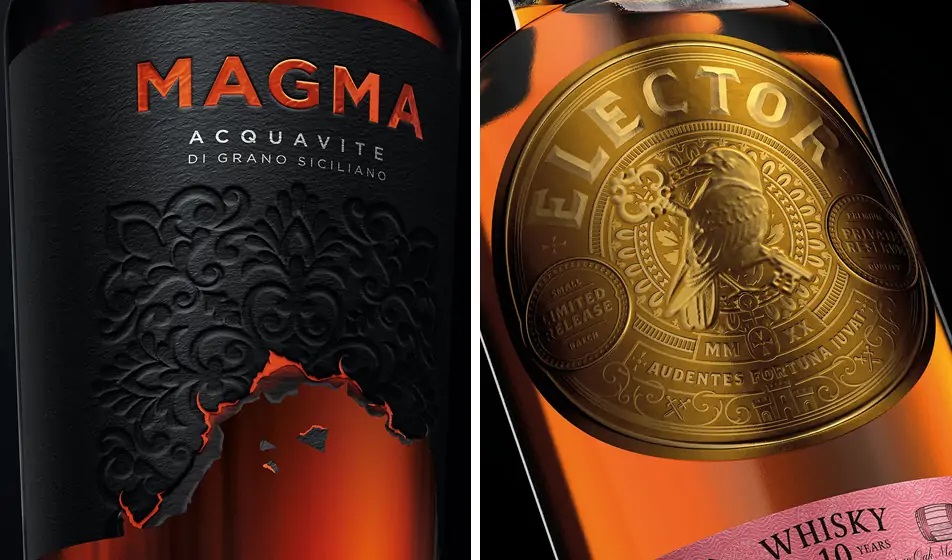 Етикетка на фото зліва надрукована на папері Avery Dennison Fasson Cotton Black офсетним та трафаретним способом, для обробки застосовані конгрев та гаряче тиснення, та використана фольга Luxor MTS 404 та Luxor MTS 362. Етикетка на фото справа зроблена на папері Avery Dentіson Fas та гарячим тисненням з використанням інструментів H+M, фольга Luxor MTS 427 та Luxor MTS 528