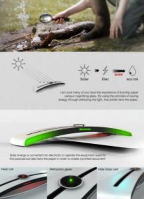 Этот принтер работает без чернил исключительно на солнечной энергии. Идея проста: небольшое устройство аккумулирует солнечный свет в тонкий пучок точно рассчитанной мощности и выжигает на бумаге текст и картинки. Чернила и картриджи не используются. Естественно, устройство "печатает" в ч.б.