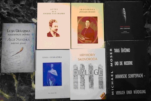 four editions in German and three in French. Among them are Dialoge by Hryhorii Skovoroda, translated by Roland Pietsch; Ausgewählte Dramen by Lesia Ukrainka; the poetry collection Drei Strophen by Dmytro Pavlychko; and the scholarly monograph Taras Ševčenko und die moderne ukrainische Schriftsprache by Michael Moser and Hans Rothe.