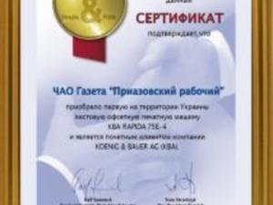 В январе сервисные инженеры компании «Полиграфимпорт» ввели в эксплуатацию первую в Украине четырёхкрасочную машину KBA Rapida 75E в типографии ЧАО «Газета "Приазовский рабочий“».