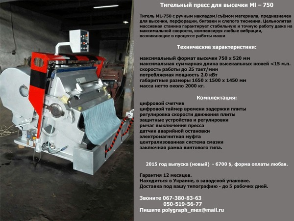 Продаю тигельный пресс для высечки Ml - 750. Новый. В заводской упаковке. Гарантия 12 месяцев. 6700 дол.