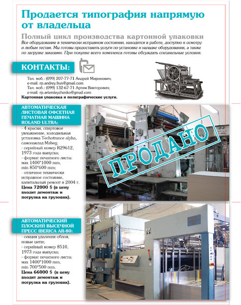 В связи с модернизацией своего производства полиграфическая Компания «Рапид-пресс» продает хорошее оборудование с возможностью создать новую типографию. Все оборудование в технически исправном состоянии, находится в работе, доступно к осмотру и любым тестам. Мы готовы предоставить услуги по установке и наладке оборудования, а также по загрузке заказами.